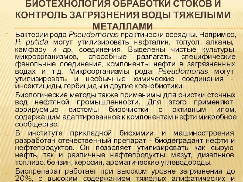 Слайд 13Биотехнология обработки стоков и контроль загрязнения воды тяжелыми металлами