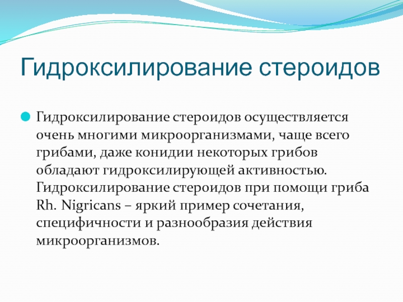 Гидроксилирование стероидов осуществляется очень многими микроорганизмами, чаще всего грибами,