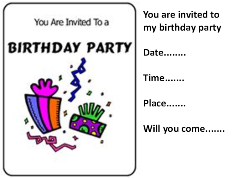You are invited to my birthday partyDate........Time.......Place.......Will you come.......