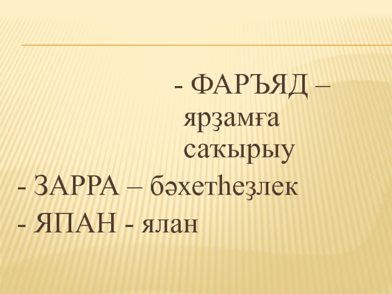 - ФАРЪЯД – ярҙамға саҡырыу- ЗАРРА – бәхетһеҙлек- ЯПАН - ялан