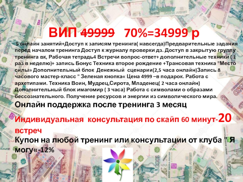 началом тренинга Доступ к журналу проверки дз. Доступ в закрытую группу тренинга вк, Рабочая тетрадь4 Встречи вопрос-ответ+ дополнительные техники ( 1 раз в неделю)+ запись Бонус Техника второе рождение +Трансовая техника "Место силы» Дополнительный блок Денежный сценарии(2,5 часа онлайн)Запись 8 часового мастер-класс " Зеленая кнопка« Цена 4999 –в подарок. Работа с архетипами. Техника Воин, Мудрец,Сирота, Младенец( 2 часа онлайн)Дополнительный блок имагомир ( 3 часа) Работа с символами о образами бессознательного. Получение ресурсов и энергии из символического мира.