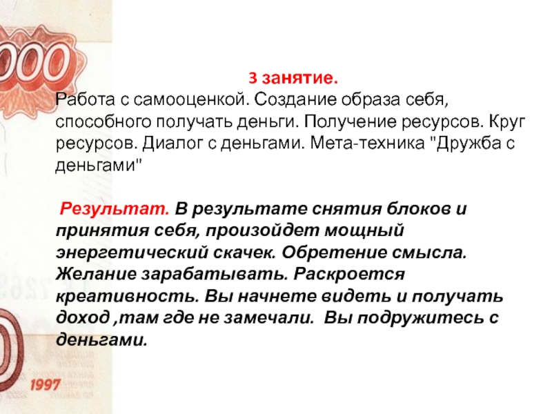 Результат. В результате снятия блоков и принятия себя, произойдет мощный энергетический скачек. Обретение смысла. Желание зарабатывать. Раскроется креативность. Вы начнете видеть и получать доход ,там где не замечали. Вы подружитесь с деньгами.