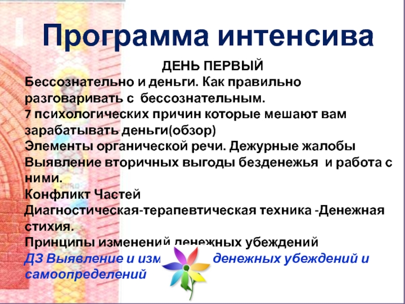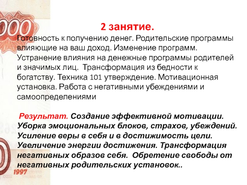 негативного денежного опыта и психотравм детства, которые мешают вам предпринимать решительные шаги к богатству, вы обретете легкость и уверенность в достижении цели. Отработка вероятных препятствий будущего