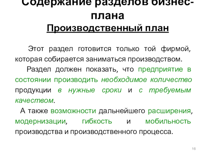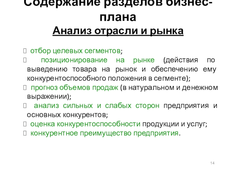 При изложении материала следует особенно проявлять реализм, не преувеличивая своих возможностей и не преуменьшая возможностей конкурентов, с тем, чтобы не подорвать доверие к предприятию и его руководству.