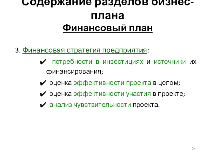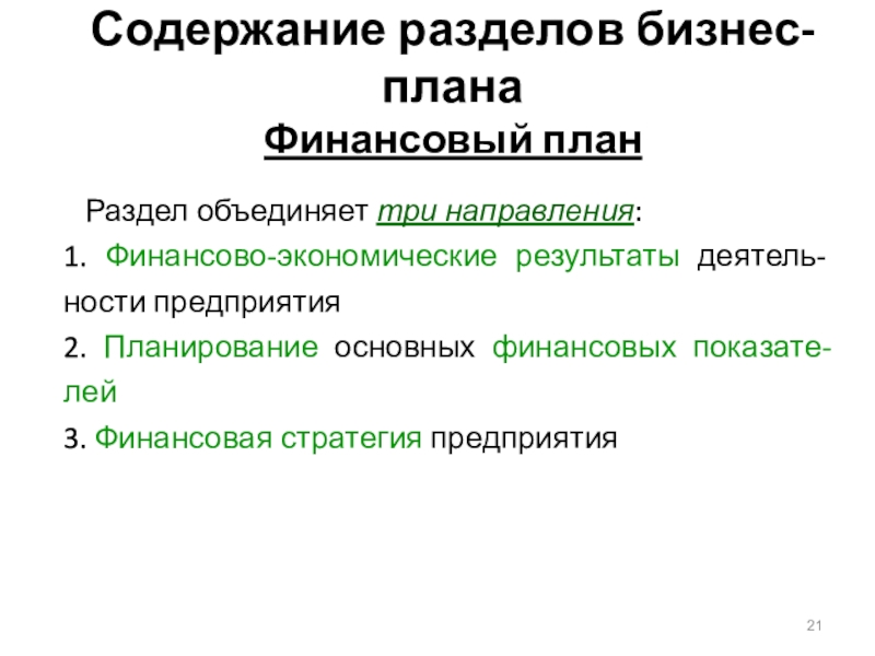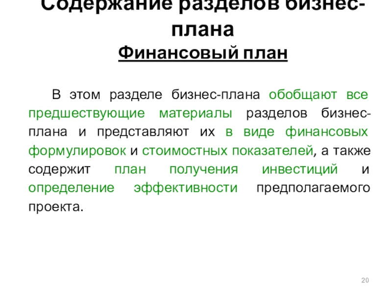 финансовых формулировок и стоимостных показателей, а также содержит план получения инвестиций и определение эффективности предполагаемого проекта.