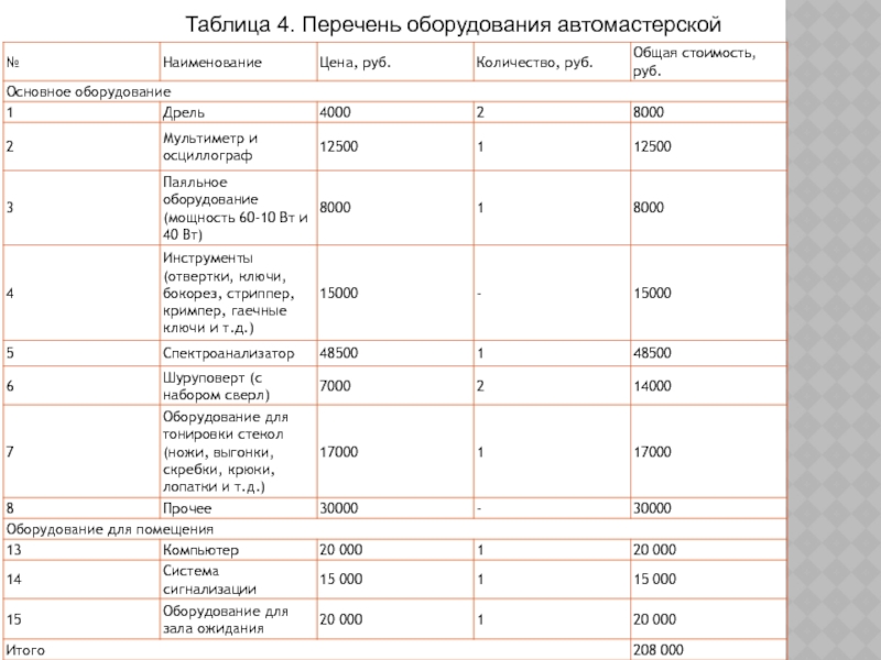 Слайд 14Таблица 4. Перечень оборудования автомастерской