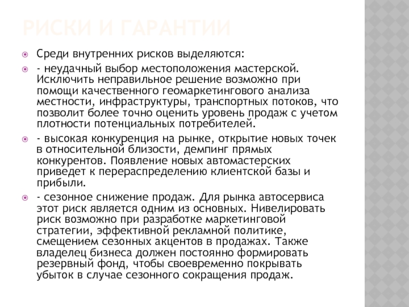 - сезонное снижение продаж. Для рынка автосервиса этот риск является одним из основных. Нивелировать риск возможно при разработке маркетинговой стратегии, эффективной рекламной политике, смещением сезонных акцентов в продажах. Также владелец бизнеса должен постоянно формировать резервный фонд, чтобы своевременно покрывать убыток в случае сезонного сокращения продаж.
