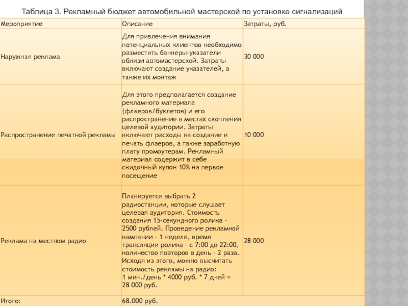 Слайд 13Таблица 3. Рекламный бюджет автомобильной мастерской по установке сигнализаций