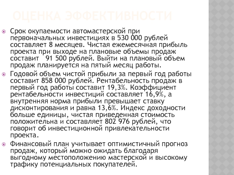 Срок окупаемости автомастерской при первоначальных инвестициях в 530 000 рублей