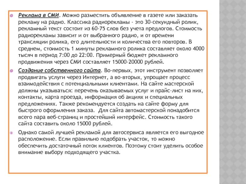 Создание собственного сайта. Во-первых, этот инструмент позволяет продвигать услуги через Интернет, а во-вторых, упрощает процесс взаимодействия с потенциальными клиентами. На сайте мастерской должны указываться: перечень оказываемых услуг и прайс-лист на них, контакты, карта проезда, информация об акциях и специальных предложениях. Также рекомендуется создать на сайте форму для быстрого оформления заказа. Для сайта автомастерской понадобится всего пара веб-страниц и простейший интерфейс. Стоимость такого сайта составить около 15000 рублей.