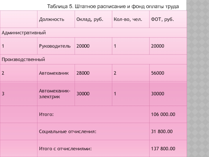 Слайд 15Таблица 5. Штатное расписание и фонд оплаты труда