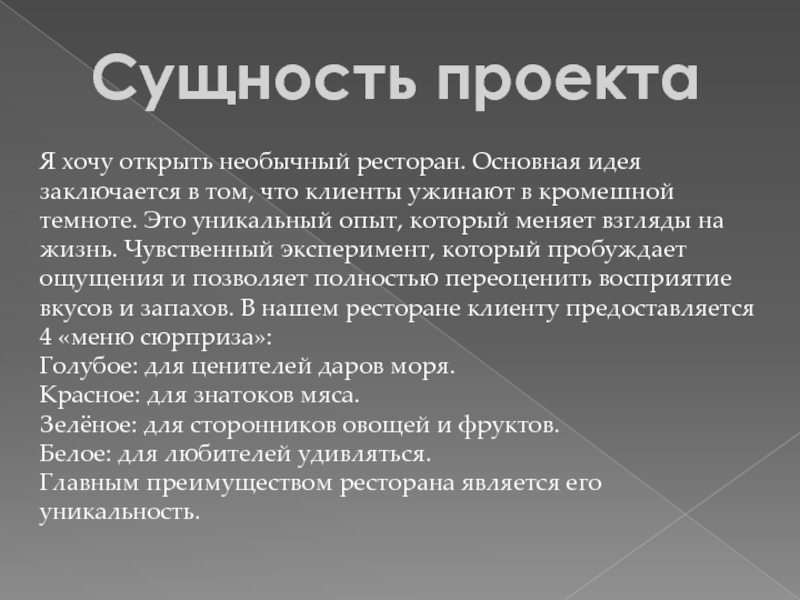 что клиенты ужинают в кромешной темноте. Это уникальный опыт, который