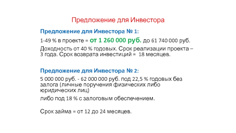 Доходность от 40 % годовых. Срок реализации проекта – 3 года. Срок возврата инвестиций = 18 месяцев.