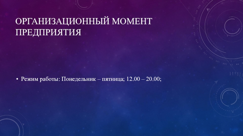 Организационный момент предприятияРежим работы: Понедельник – пятница; 12.00 – 20.00;