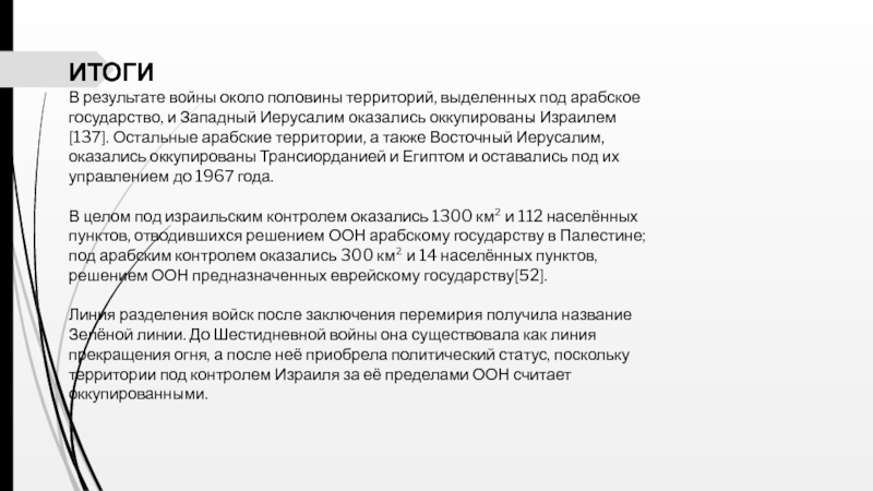 В целом под израильским контролем оказались 1300 км² и 112 населённых пунктов, отводившихся решением ООН арабскому государству в Палестине; под арабским контролем оказались 300 км² и 14 населённых пунктов, решением ООН предназначенных еврейскому государству[52].