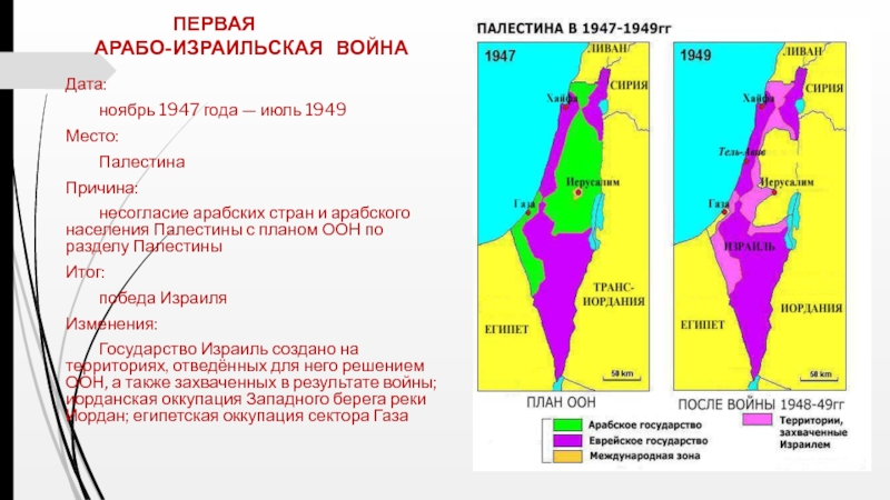 Государство Израиль создано на территориях, отведённых для него решением ООН, а также захваченных в результате войны; иорданская оккупация Западного берега реки Иордан; египетская оккупация сектора Газа