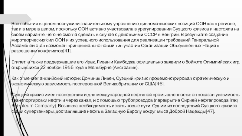 Как отмечает английский историк Доминик Ливен, Суэцкий кризис продемонстрировал стратегическую и экономическую зависимость послевоенной Великобритании от США[46].