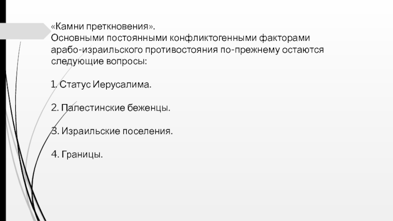 Основными постоянными конфликтогенными факторами арабо-израильского противостояния по-прежнему остаются следующие