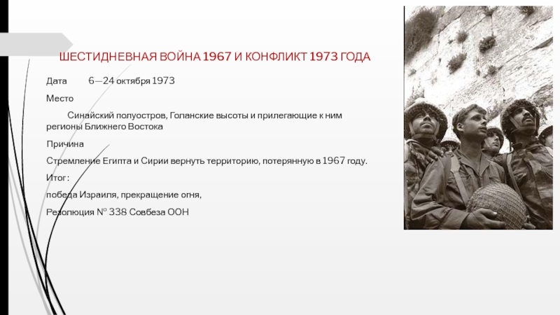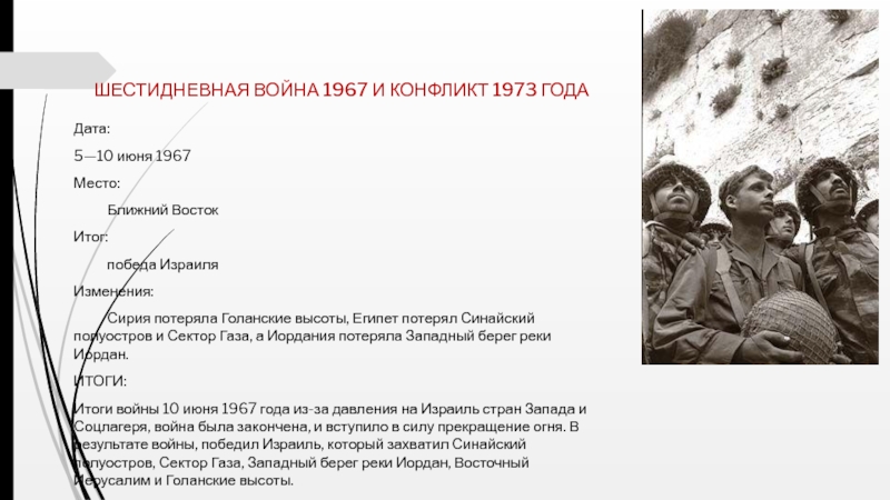Слайд 10 ШЕСТИДНЕВНАЯ ВОЙНА 1967 И КОНФЛИКТ 1973 ГОДА