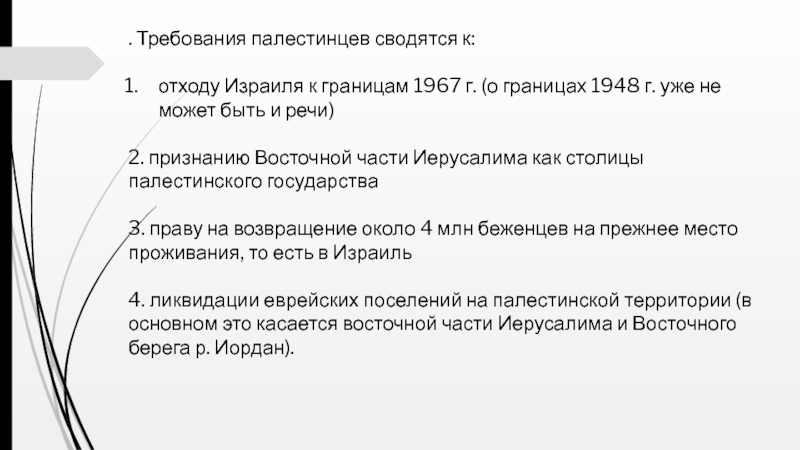 4. ликвидации еврейских поселений на палестинской территории (в основном это касается восточной части Иерусалима и Восточного берега р. Иордан).