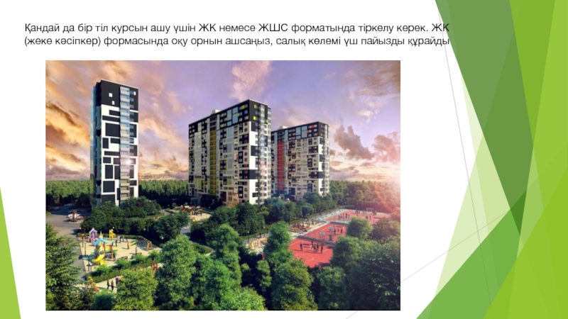 Слайд 4Қандай да бір тіл курсын ашу үшін ЖК немесе ЖШС форматында