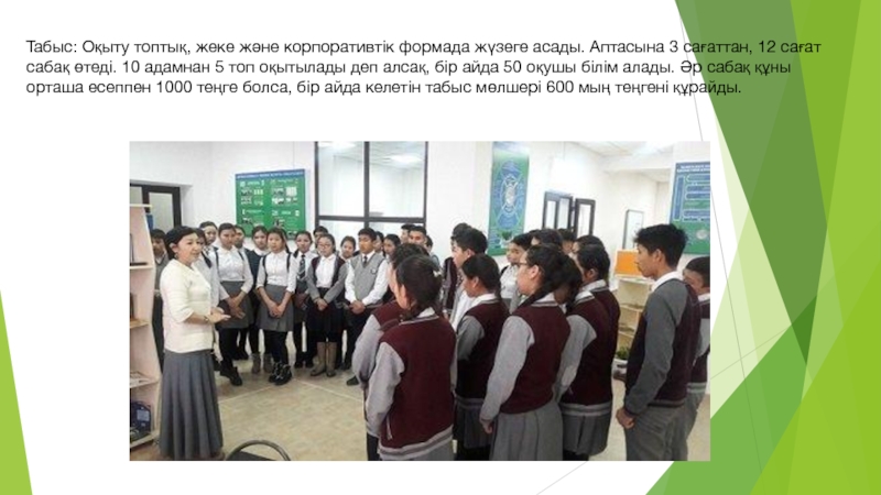 Слайд 7Табыс: Оқыту топтық, жеке және корпоративтік формада жүзеге асады. Аптасына