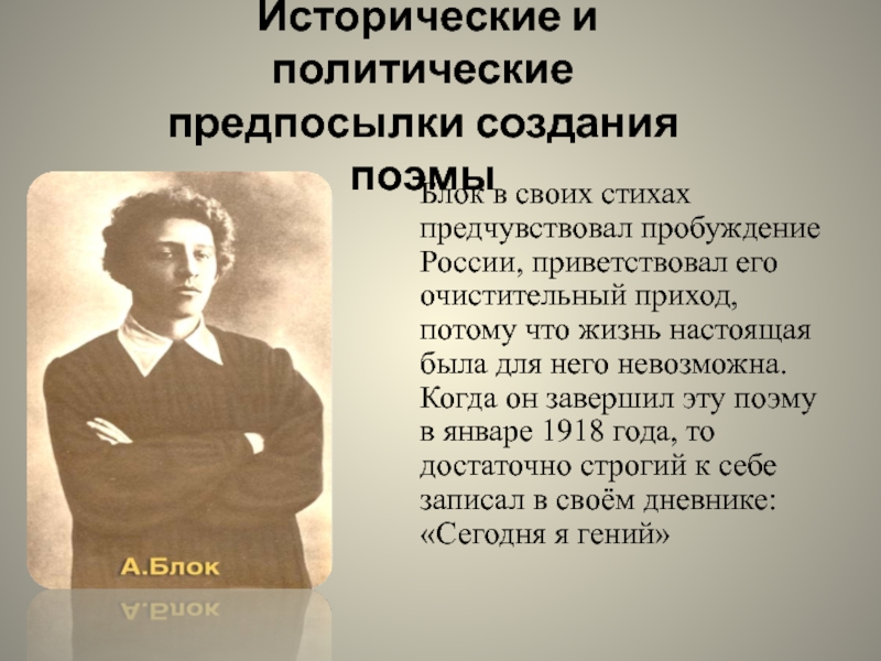 что жизнь настоящая была для него невозможна. Когда он завершил эту поэму в январе 1918 года, то достаточно строгий к себе записал в своём дневнике: «Сегодня я гений»
