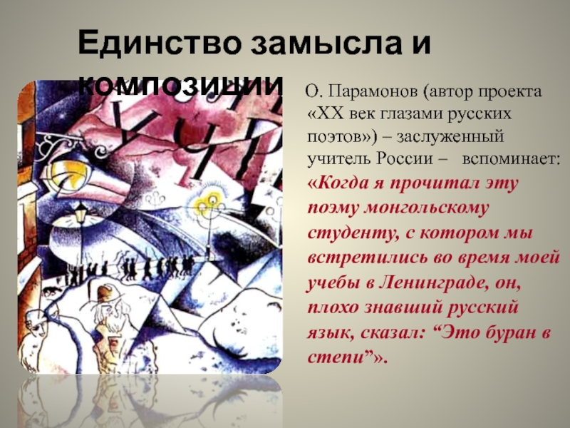 прочитал эту поэму монгольскому студенту, с котором мы встретились во время моей учебы в Ленинграде, он, плохо знавший русский язык, сказал: “Это буран в степи”».