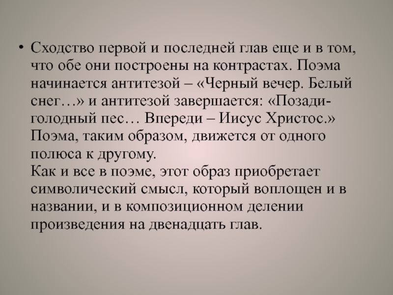 вечер. Белый снег…» и антитезой завершается: «Позади- голодный пес… Впереди – Иисус Христос.» Поэма, таким образом, движется от одного полюса к другому.