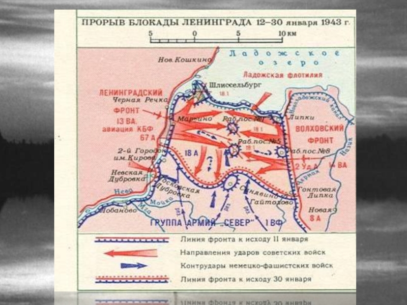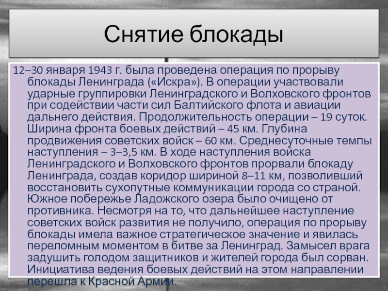ударные группировки Ленинградского и Волховского фронтов при содействии части сил Балтийского флота и авиации дальнего действия. Продолжительность операции – 19 суток. Ширина фронта боевых действий – 45 км. Глубина продвижения советских войск – 60 км. Среднесуточные темпы наступления – 3–3,5 км. В ходе наступления войска Ленинградского и Волховского фронтов прорвали блокаду Ленинграда, создав коридор шириной 8–11 км, позволивший восстановить сухопутные коммуникации города со страной. Южное побережье Ладожского озера было очищено от противника. Несмотря на то, что дальнейшее наступление советских войск развития не получило, операция по прорыву блокады имела важное стратегическое значение и явилась переломным моментом в битве за Ленинград. Замысел врага задушить голодом защитников и жителей города был сорван. Инициатива ведения боевых действий на этом направлении перешла к Красной Армии.