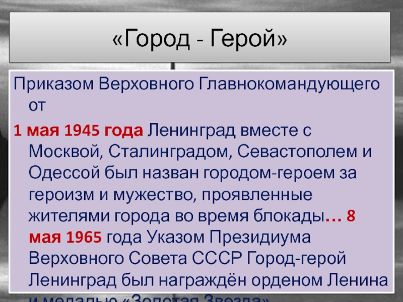 городом-героем за героизм и мужество, проявленные жителями города во время блокады… 8 мая 1965 года Указом Президиума Верховного Совета СССР Город-герой Ленинград был награждён орденом Ленина и медалью «Золотая Звезда».