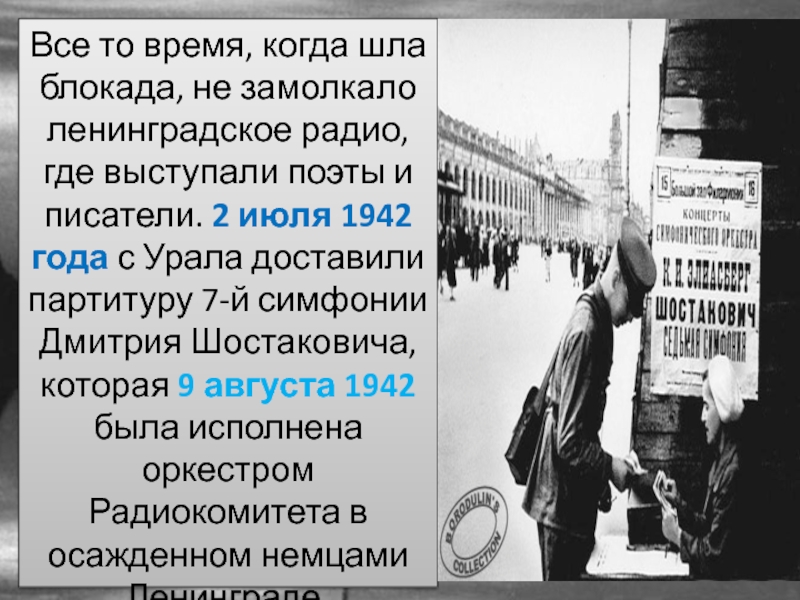 Слайд 7Все то время, когда шла блокада, не замолкало ленинградское радио,