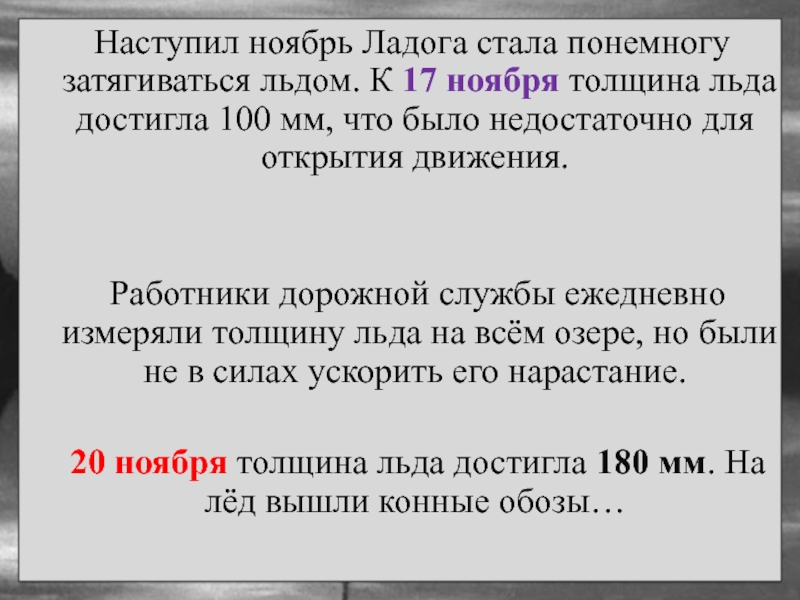 Слайд 9 Наступил ноябрь Ладога стала понемногу затягиваться льдом. К