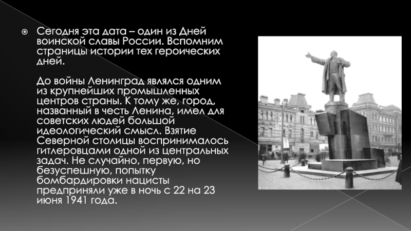 из крупнейших промышленных центров страны. К тому же, город, названный в честь Ленина, имел для советских людей большой идеологический смысл. Взятие Северной столицы воспринималось гитлеровцами одной из центральных задач. Не случайно, первую, но безуспешную, попытку бомбардировки нацисты предприняли уже в ночь с 22 на 23 июня 1941 года.