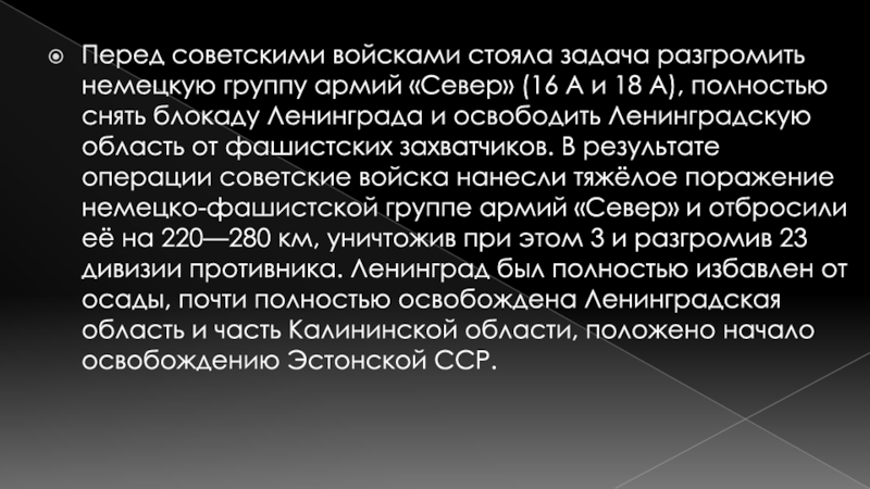 освободить Ленинградскую область от фашистских захватчиков. В результате операции советские войска нанесли тяжёлое поражение немецко-фашистской группе армий «Север» и отбросили её на 220—280 км, уничтожив при этом 3 и разгромив 23 дивизии противника. Ленинград был полностью избавлен от осады, почти полностью освобождена Ленинградская область и часть Калининской области, положено начало освобождению Эстонской ССР.