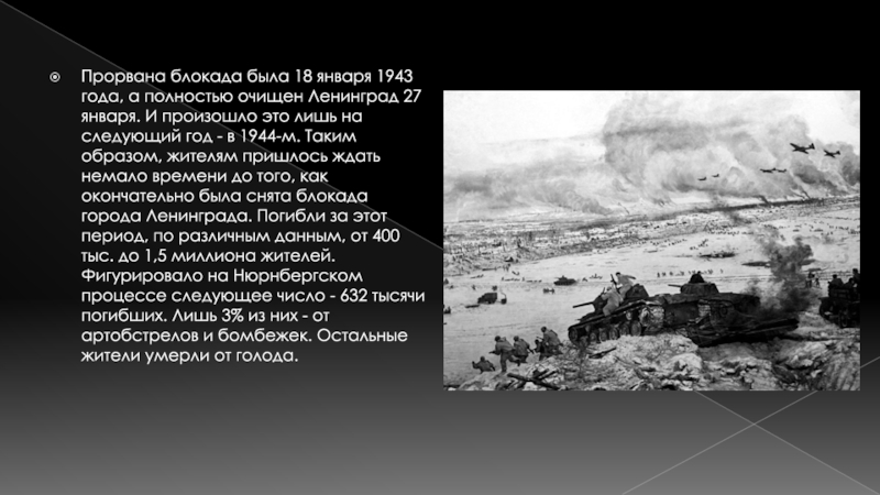 Слайд 5Прорвана блокада была 18 января 1943 года, а полностью очищен