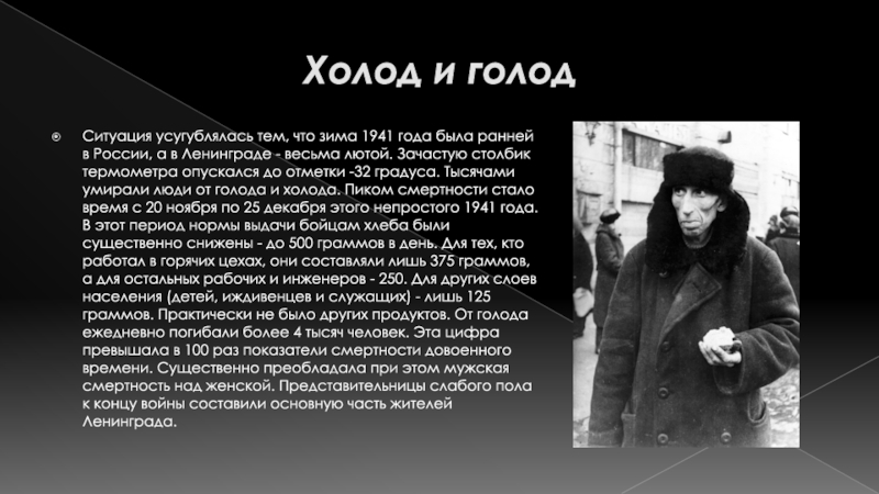 Холод и голодСитуация усугублялась тем, что зима 1941 года была ранней в России, а в Ленинграде -