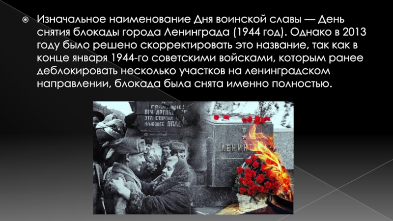 Изначальное наименование Дня воинской славы — День снятия блокады города Ленинграда (1944 год). Однако в 2013 году