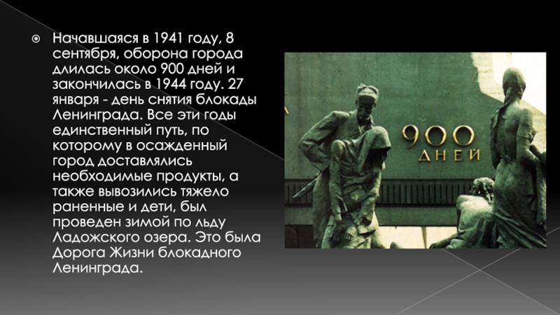 Начавшаяся в 1941 году, 8 сентября, оборона города длилась около 900 дней и закончилась в 1944 году.