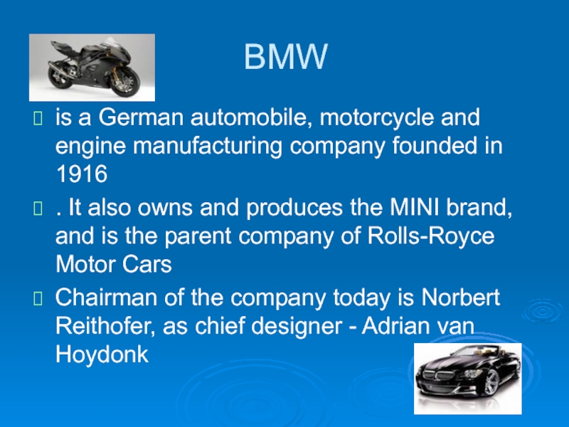 MINI brand, and is the parent company of Rolls-Royce Motor Cars Chairman of the company today is Norbert Reithofer, as chief designer - Adrian van Hoydonk