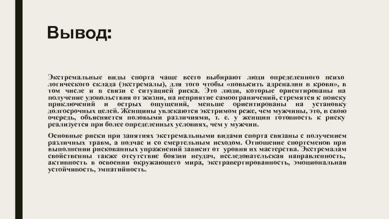 Вывод:Экстремальные виды спорта чаще всего выбирают люди определенного психо­логического склада (экстремалы), для того чтобы «повысить адреналин в