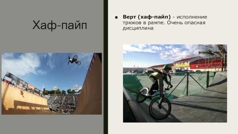 Хаф-пайпВерт (хаф-пайп) - исполнение трюков в рампе. Очень опасная дисциплина