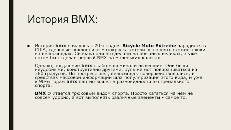 История BMX:История bmx началась с 70-х годов. Bicycle Moto Extreme зародился в США, где юные поклонники мотокросса хотели выполнять схожие трюки