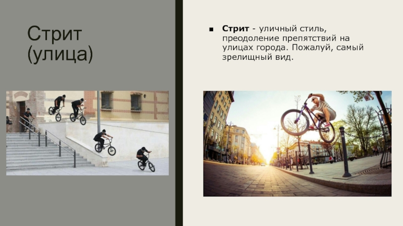 Стрит (улица)Стрит - уличный стиль, преодоление препятствий на улицах города. Пожалуй, самый зрелищный вид.