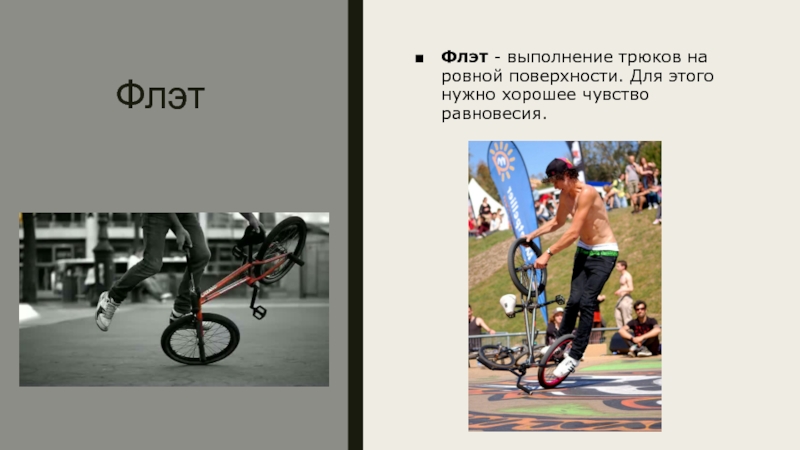 ФлэтФлэт - выполнение трюков на ровной поверхности. Для этого нужно хорошее чувство равновесия.