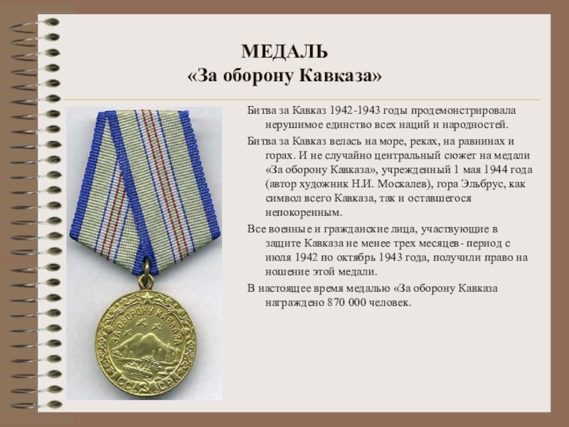 В настоящее время медалью «За оборону Кавказа награждено 870 000 человек.