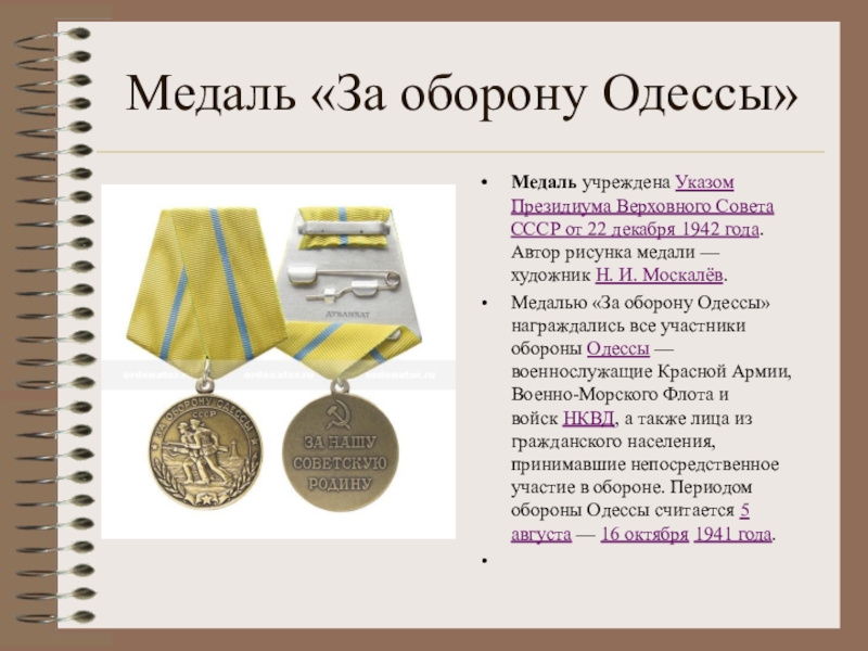 медалей «За оборону Москвы»[2], «За оборону Ленинграда», «За оборону Севастополя»,
