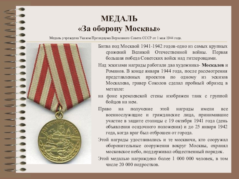 Осенью 1941 года, когда враг рвался к столице, художник Николай Иванович Москалев в свободные от работы часы трудился над эскизом медали "За оборону Москвы". На недоуменные вопросы друзей — время ли заниматься этим, когда положение на фронтах тяжелейшее, Москалев отвечал: "Это временные трудности. Вот увидите, у ворот Москвы Красная Армия непременно перебьет врагу хребет, и тогда новые заслуженные в боях награды будут сиять на груди наших воинов".