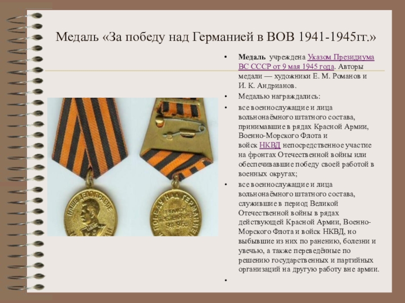 Слайд 26Медаль «За победу над Германией в ВОВ 1941-1945гг.»