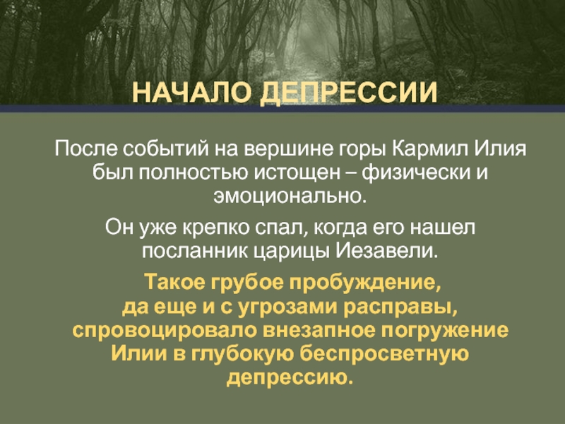 да еще и с угрозами расправы, спровоцировало внезапное погружение Илии в глубокую беспросветную депрессию.